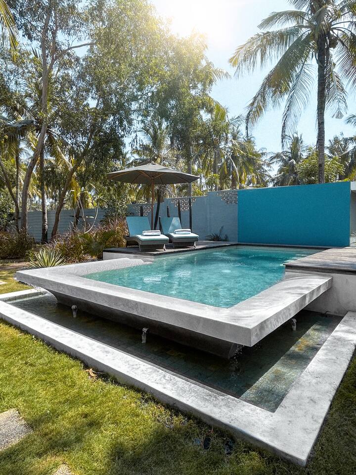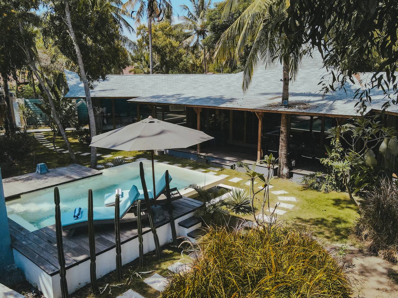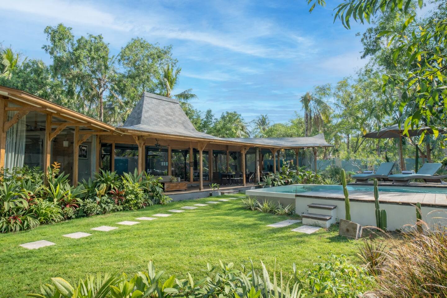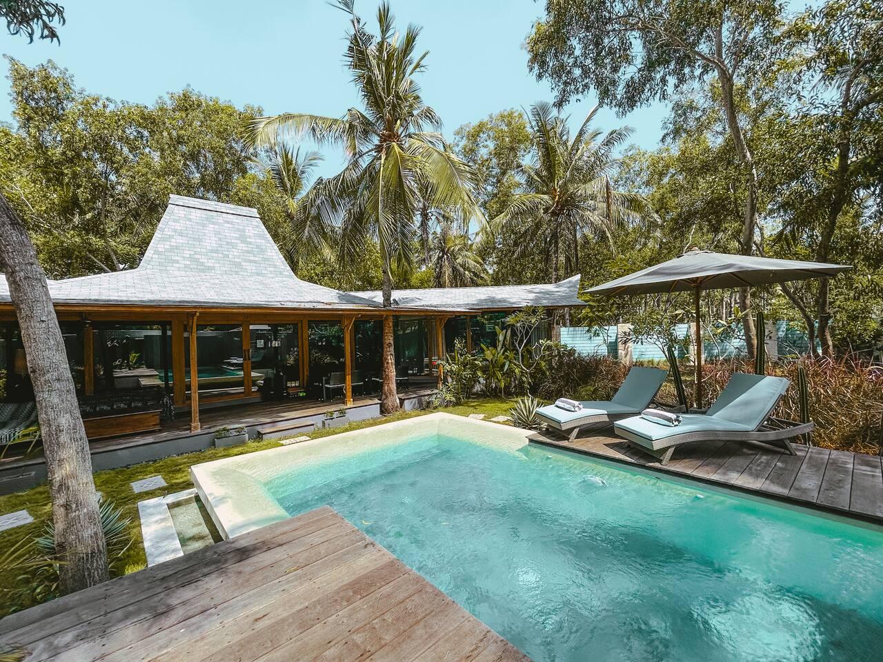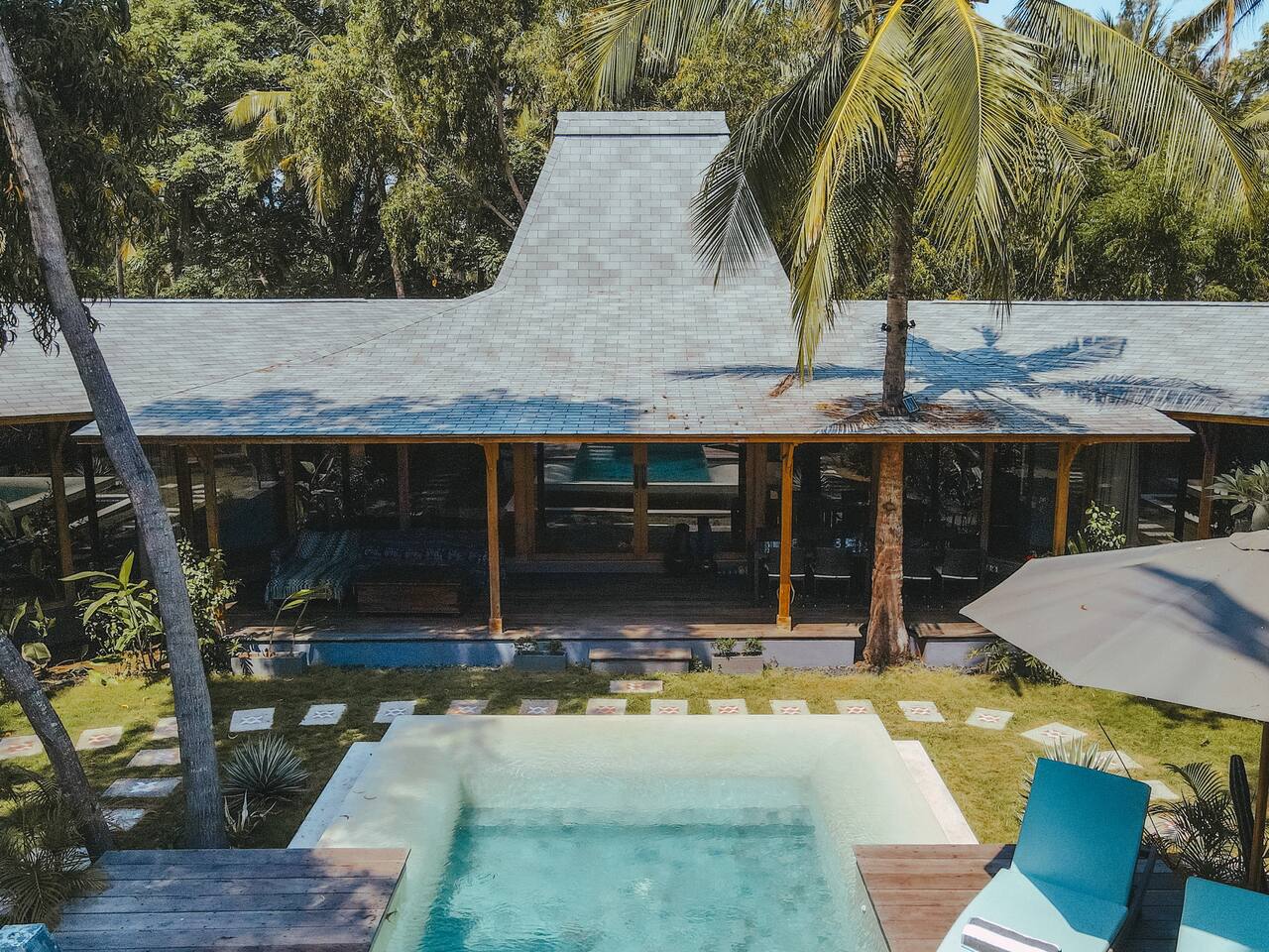 Welcome to VILLA HARIMAU on Gili Trawangan. This beautifully repurposed 3-bedroom Joglo house offers the best of both traditional and modern living. The villa is just a 3-minute walk from the beach – close enough to make it feel like your backyard, but far enough that you won’t wake up with a sandcastle in your living room. It’s private, peaceful, and perfect for families, friends, or anyone craving a tropical escape with a little extra quiet.