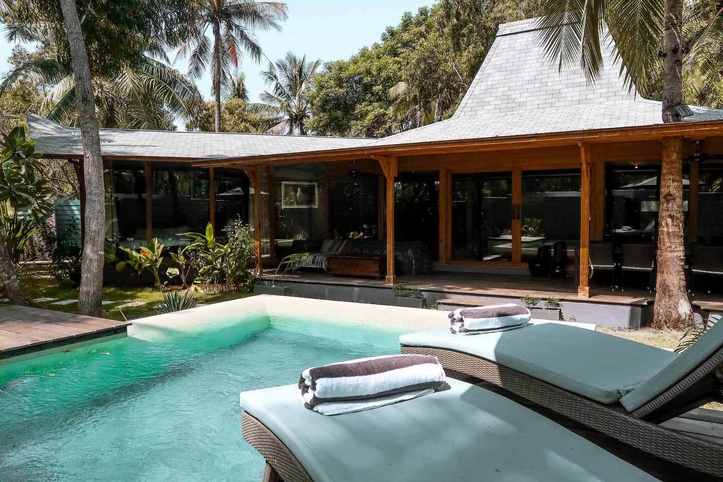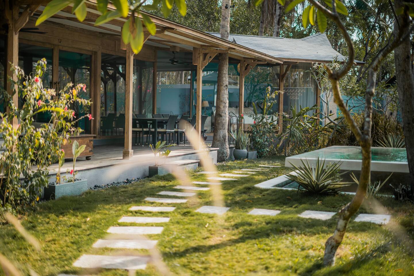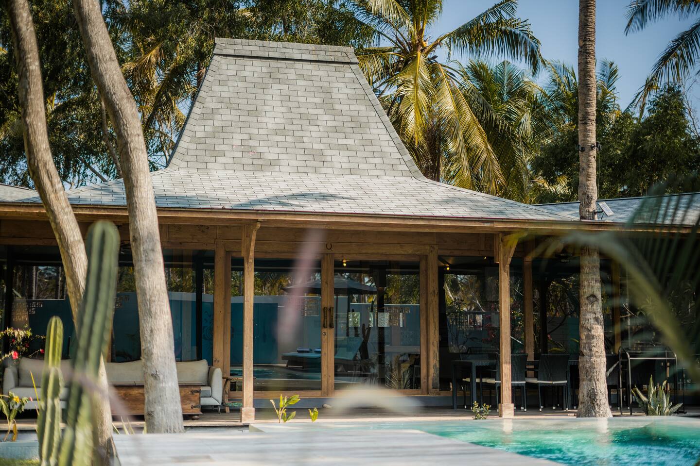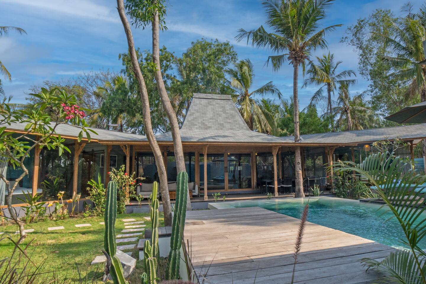 Welcome to VILLA HARIMAU on Gili Trawangan. This beautifully repurposed 3-bedroom Joglo house offers the best of both traditional and modern living. The villa is just a 3-minute walk from the beach – close enough to make it feel like your backyard, but far enough that you won’t wake up with a sandcastle in your living room. It’s private, peaceful, and perfect for families, friends, or anyone craving a tropical escape with a little extra quiet.
