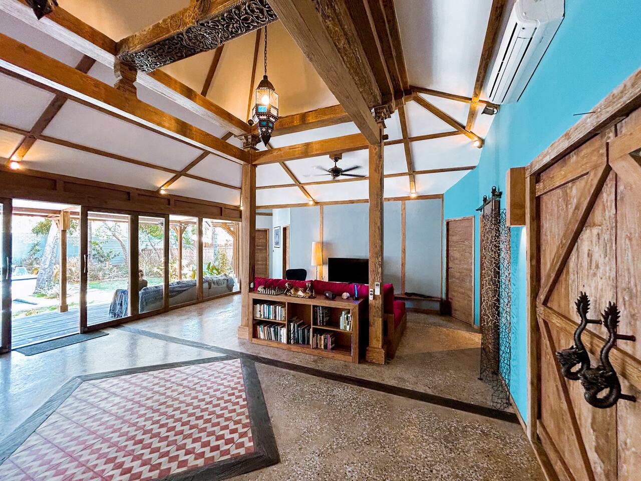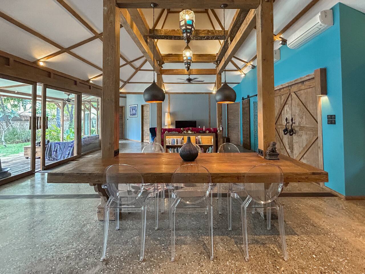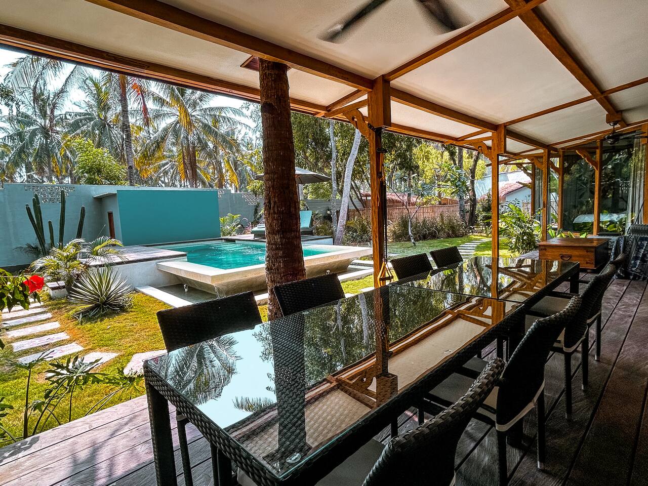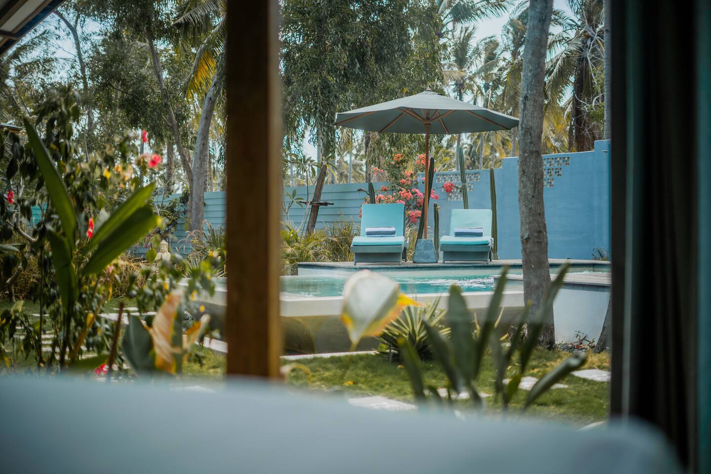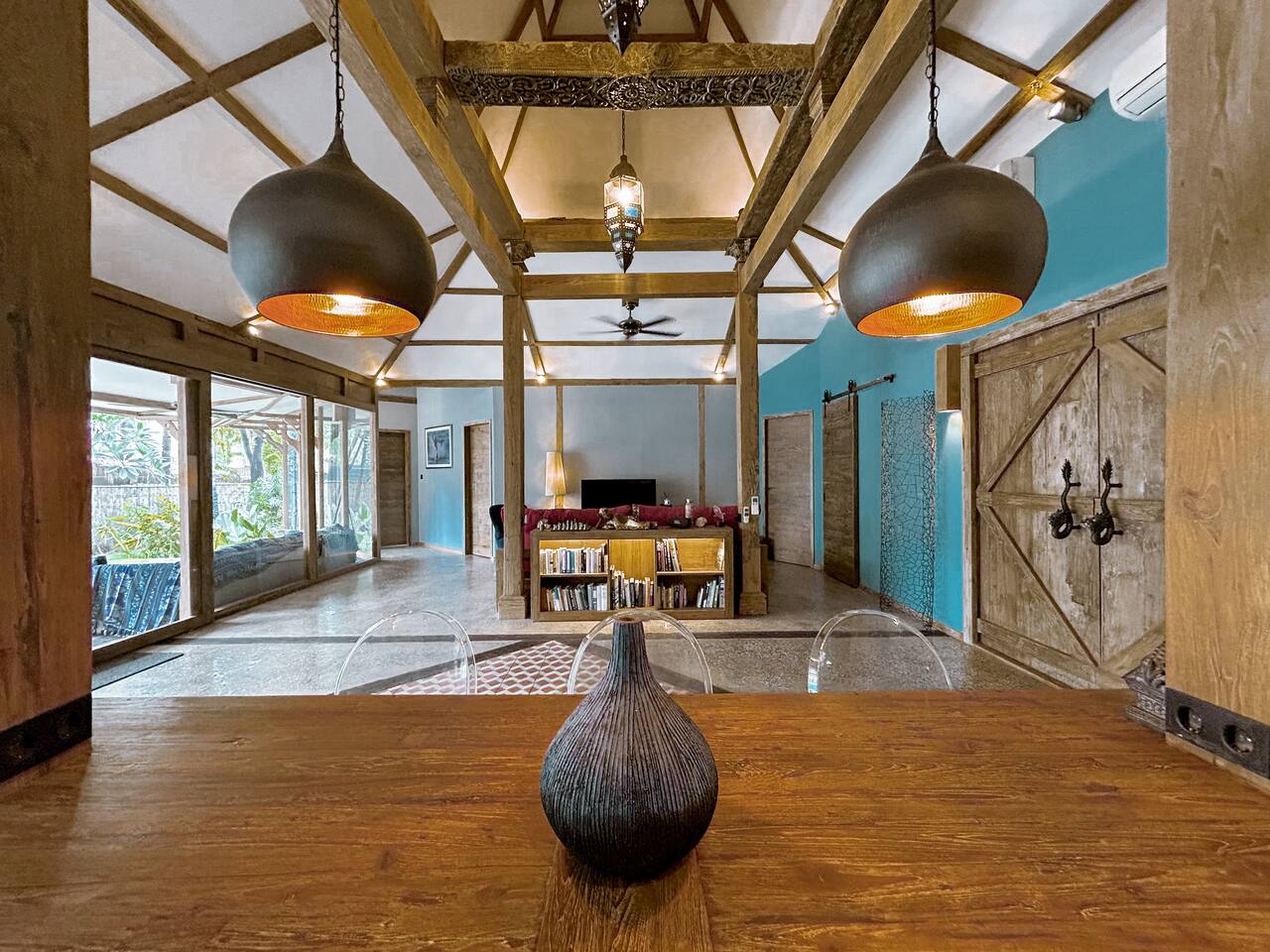 Welcome to VILLA HARIMAU on Gili Trawangan. This beautifully repurposed 3-bedroom Joglo house offers the best of both traditional and modern living. The villa is just a 3-minute walk from the beach – close enough to make it feel like your backyard, but far enough that you won’t wake up with a sandcastle in your living room. It’s private, peaceful, and perfect for families, friends, or anyone craving a tropical escape with a little extra quiet.